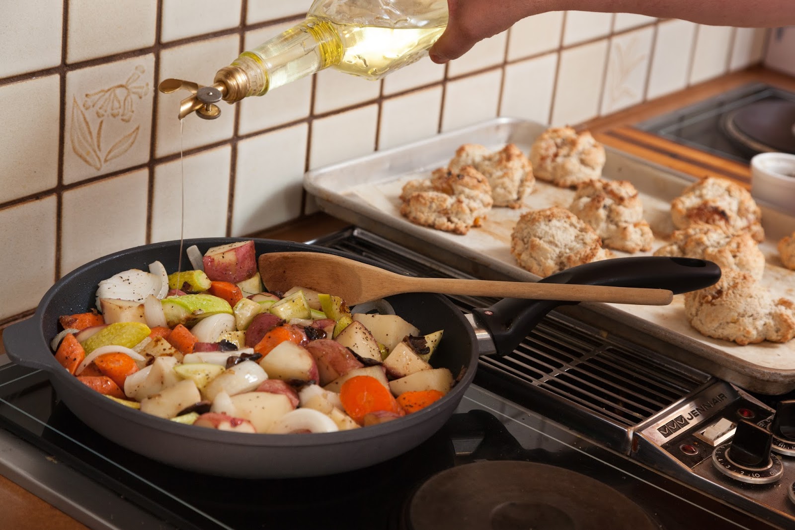 For a recent photo shoot ( thank you Jumping Rocks!) we made up a batch of fall hash using it. The recipe follows. You can substitute all kinds of veggies in this dish, but don’t mess with a mediocre pan. Go Swiss Diamond!