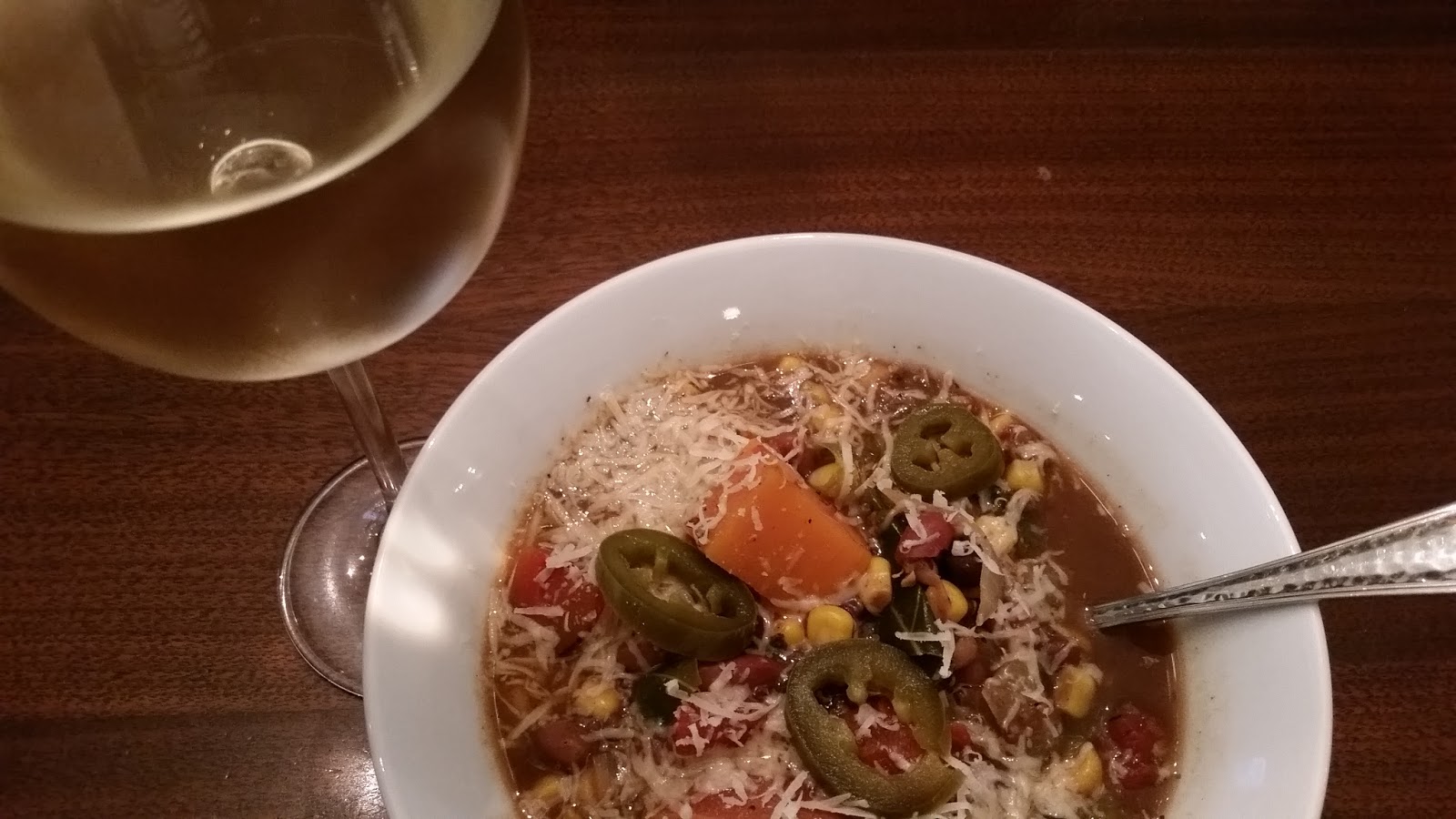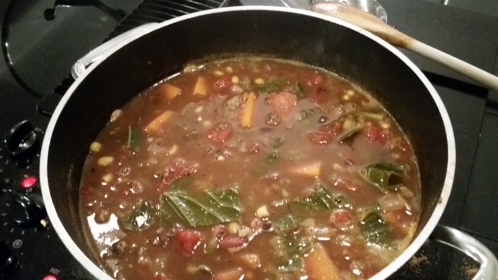 When the beans are tender, add the vegetables from the skillet. Add the quinoa, sweet potato, roasted tomatoes, corn, chilies, plus all of the spices to the pot of beans. Simmer for 45-60 minutes or until the sweet potato is tender.